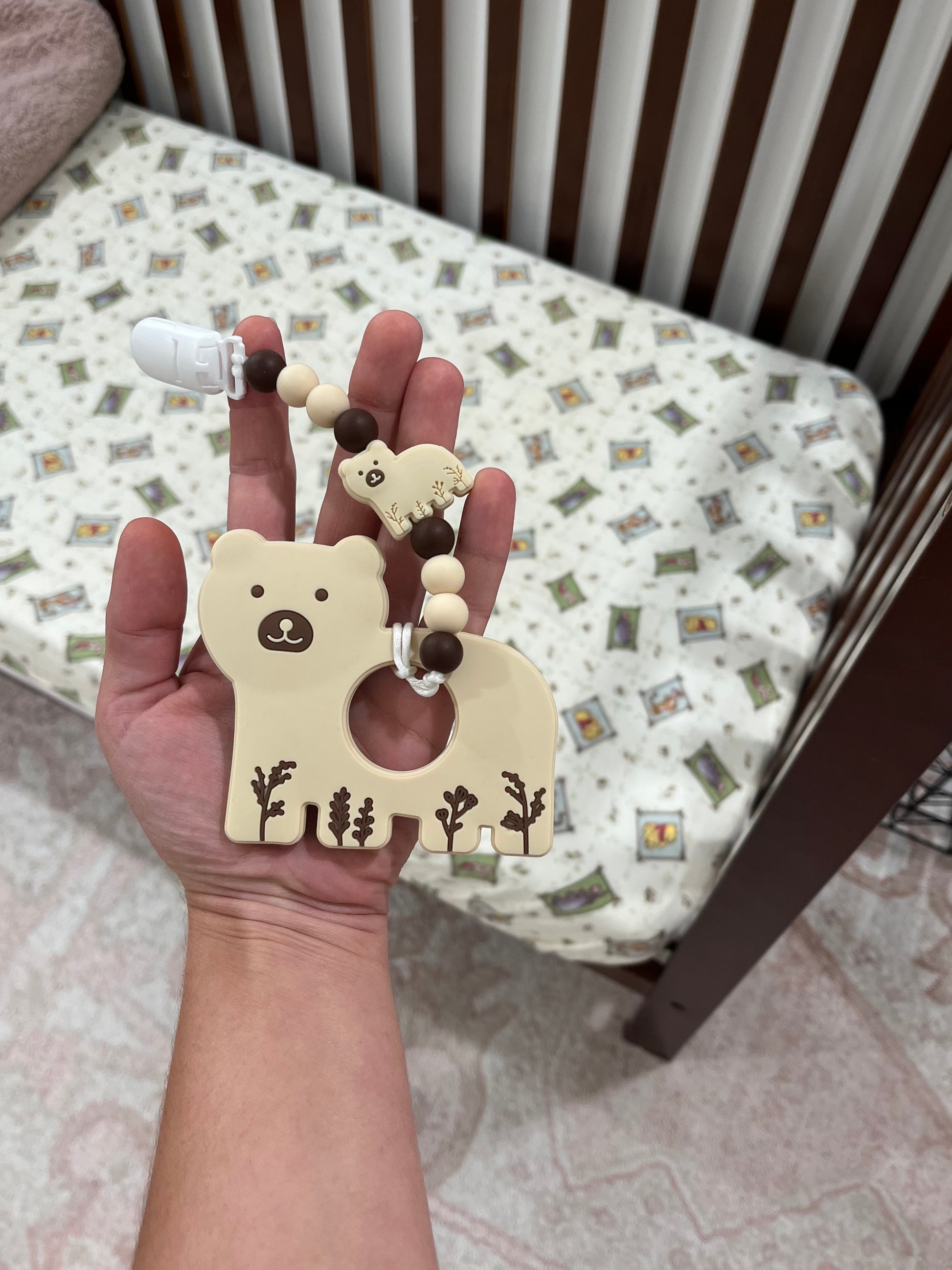 Help your little one find soothing relief with the Momma & Baby Bear silicone teether. Crafted from safe, non-toxic silicone, it offers gentle comfort for delicate gums during the teething stage. Its adorable design adds a charming touch that both babies and parents will love, making teething time a little brighter and easier to handle.